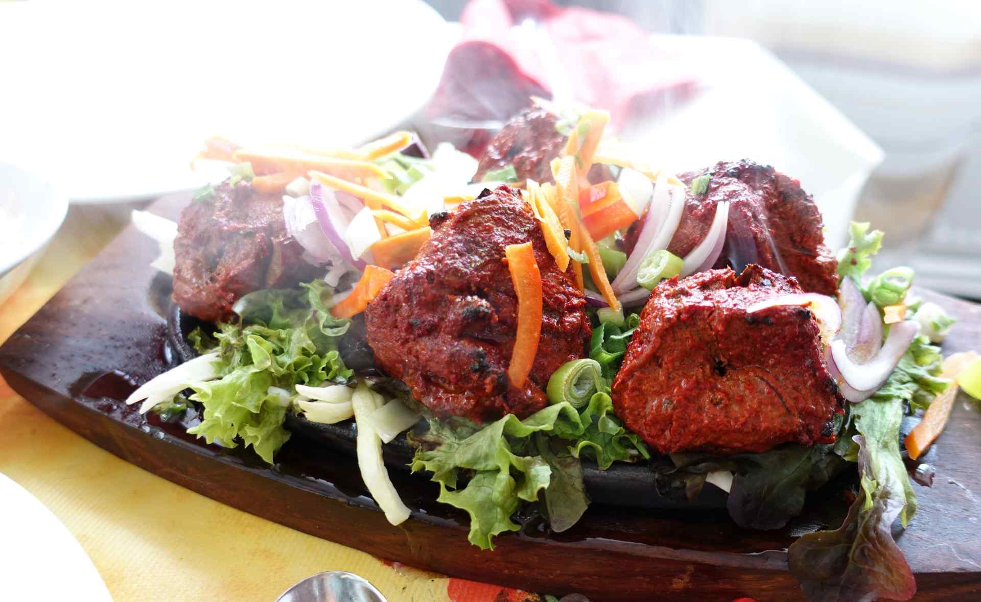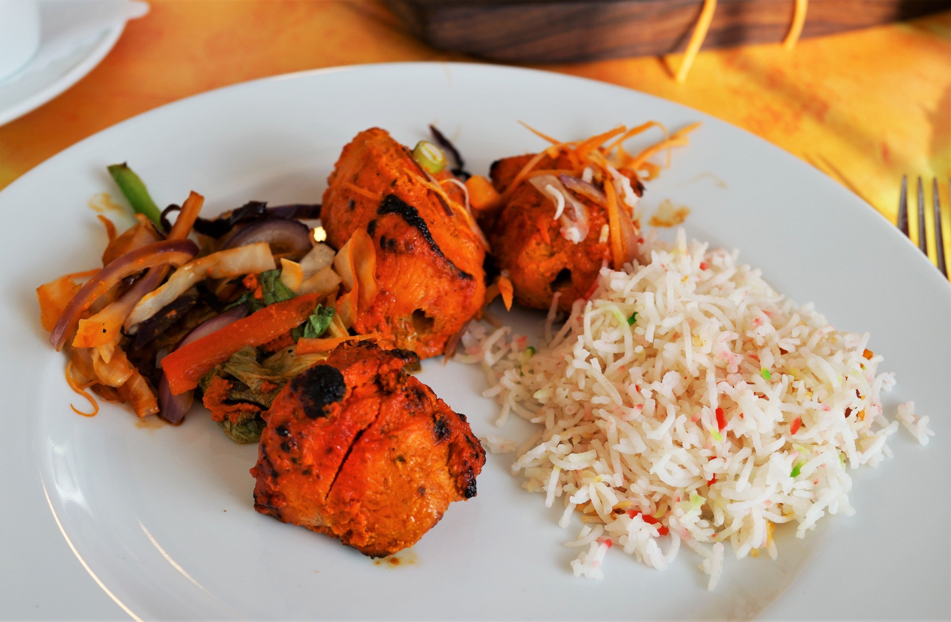 Tandoori-Hähnchen: Mariniertes Hähnchen, das im Tandoor (Lehmofen) gebacken wird und eine rauchige Note erhält.